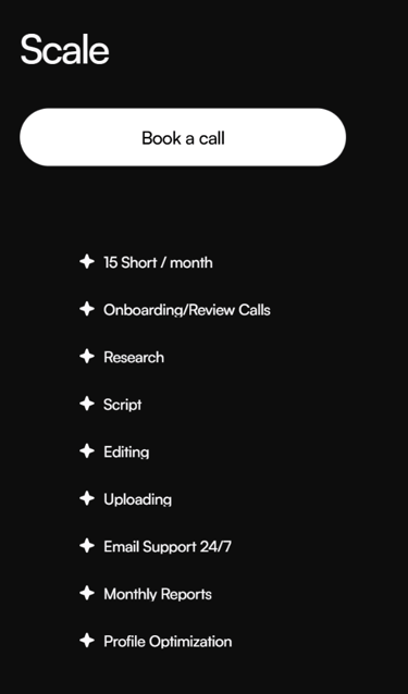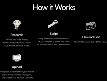 We take on as much workload as we can. We will research, script, edit and upload for you. The only thing you need to do is film since it is your personal brand. Filming time varies from person to person but for most people 4 hours a month of filming usually does the trick.